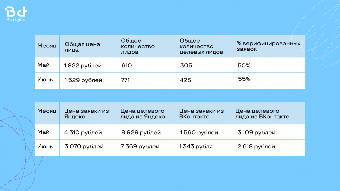 Затем, на основе аналитики марта, мы смогли сократить цену квалифицированного лида сначала до 4 752 рублей в апреле, а затем и до 2 768 в июне.
