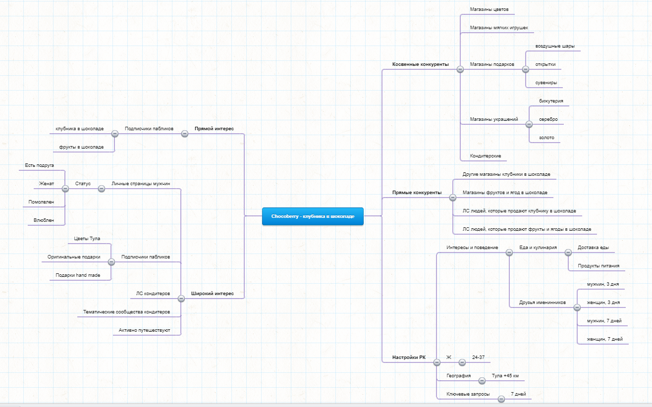 Он длится 14 дней. В первую очередь мы подготовили майнд-карту проекта, в которой выделили аудитории, которые хотели протестировать в первую очередь. Также при создании объявлений сразу поставили аудитории на сбор событий (все позитивные действия, все негативные действия, перешли по ссылке или в сообщество, написали сообщение в группу, понравилась запись, поделились записью, просмотрели запись).