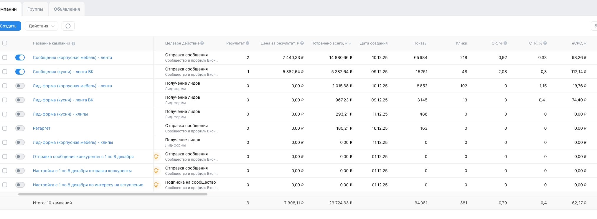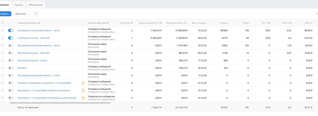 Приветствую! У меня уже был опыт запуска рекламы на кухни и корпусную мебель, поэтому к клиенту я уже пришла с готовой стратегией и примерными результатами. Новый клиент обратился ко мне в конце 2025 г.