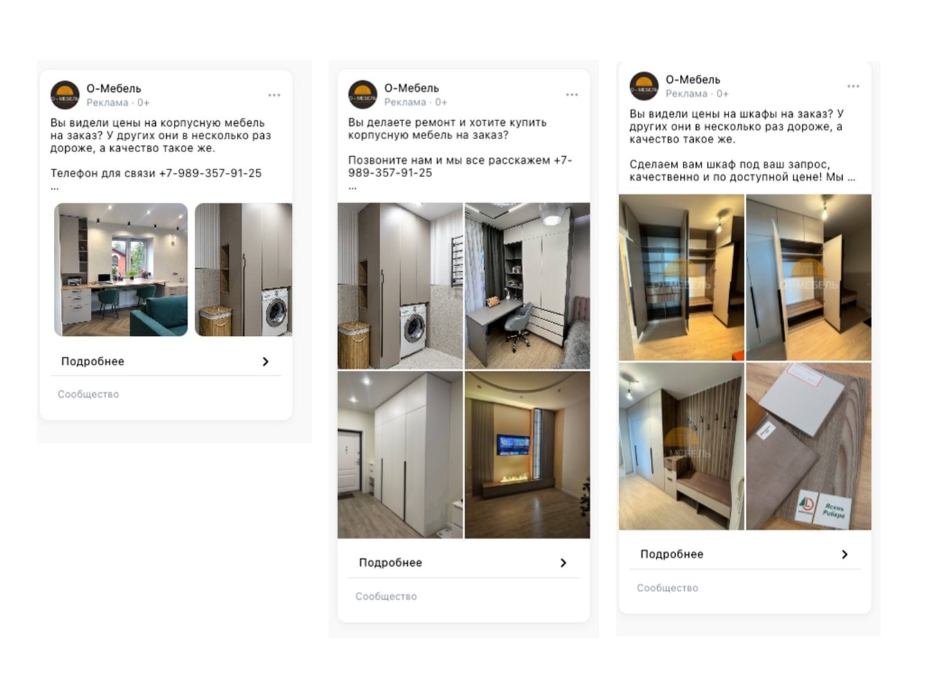 В рекламе было несколько офферов и бонус — проект и выезд на замер бесплатно. Тестировали фото, видео. Более кликабельный формат получился 4 фото. Тестировали также несколько настроек — ключевые фразы (кухни, купить шкаф на заказ итд), на тему ремонт и покупка мебели, на тему ремонт и покупка мебели + ключевые фразы. Трафик вели на сообщения сообщества и на лид-форму. В лид-форму было более 100 переходов, но не было заявок. Тогда у нас появилась гипотеза, что пользователи хотят больше узнать о продукте (посмотреть отзывы, работы и уточнить информацию) и потом уже оставлять свои контактные данные.