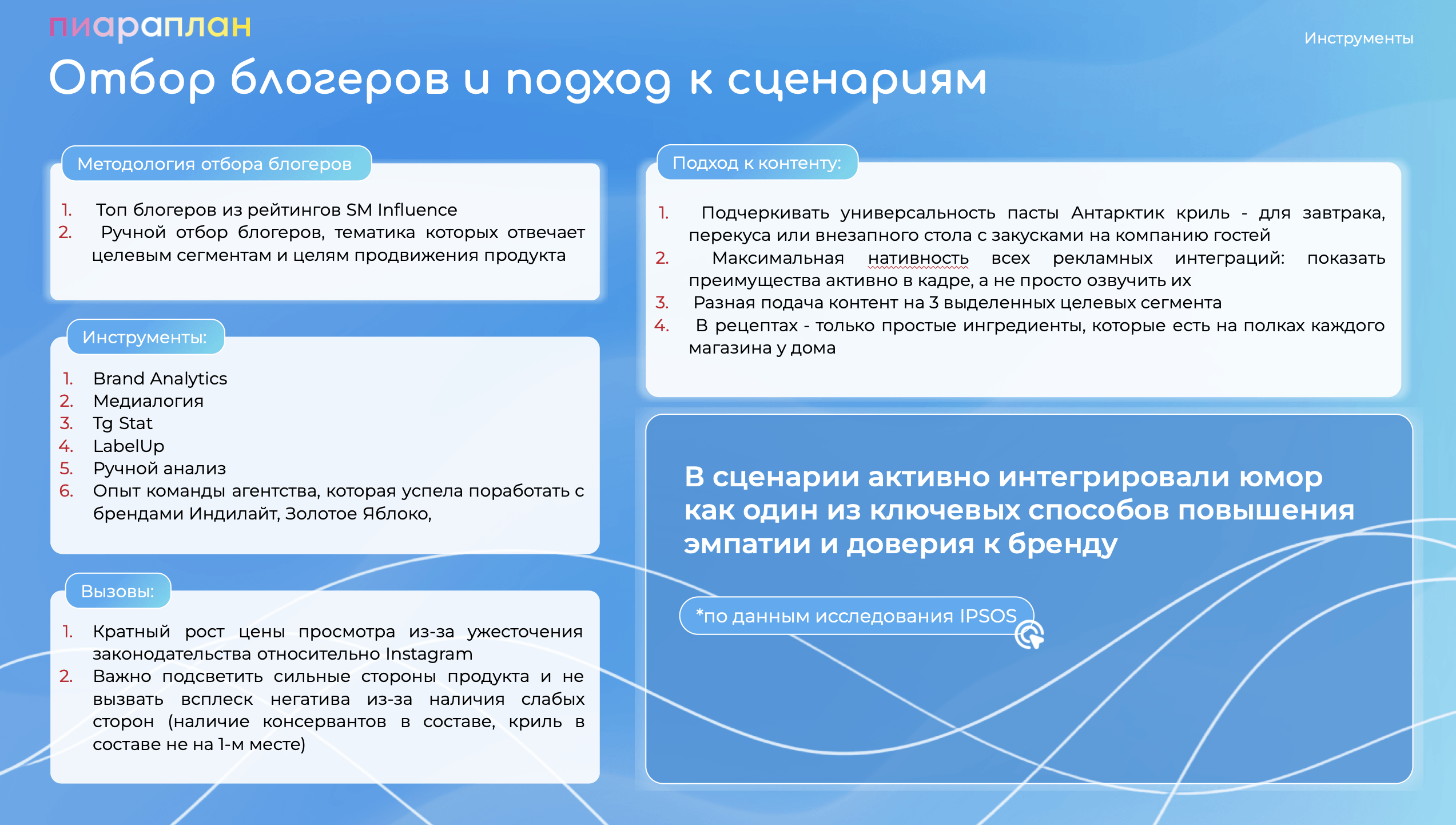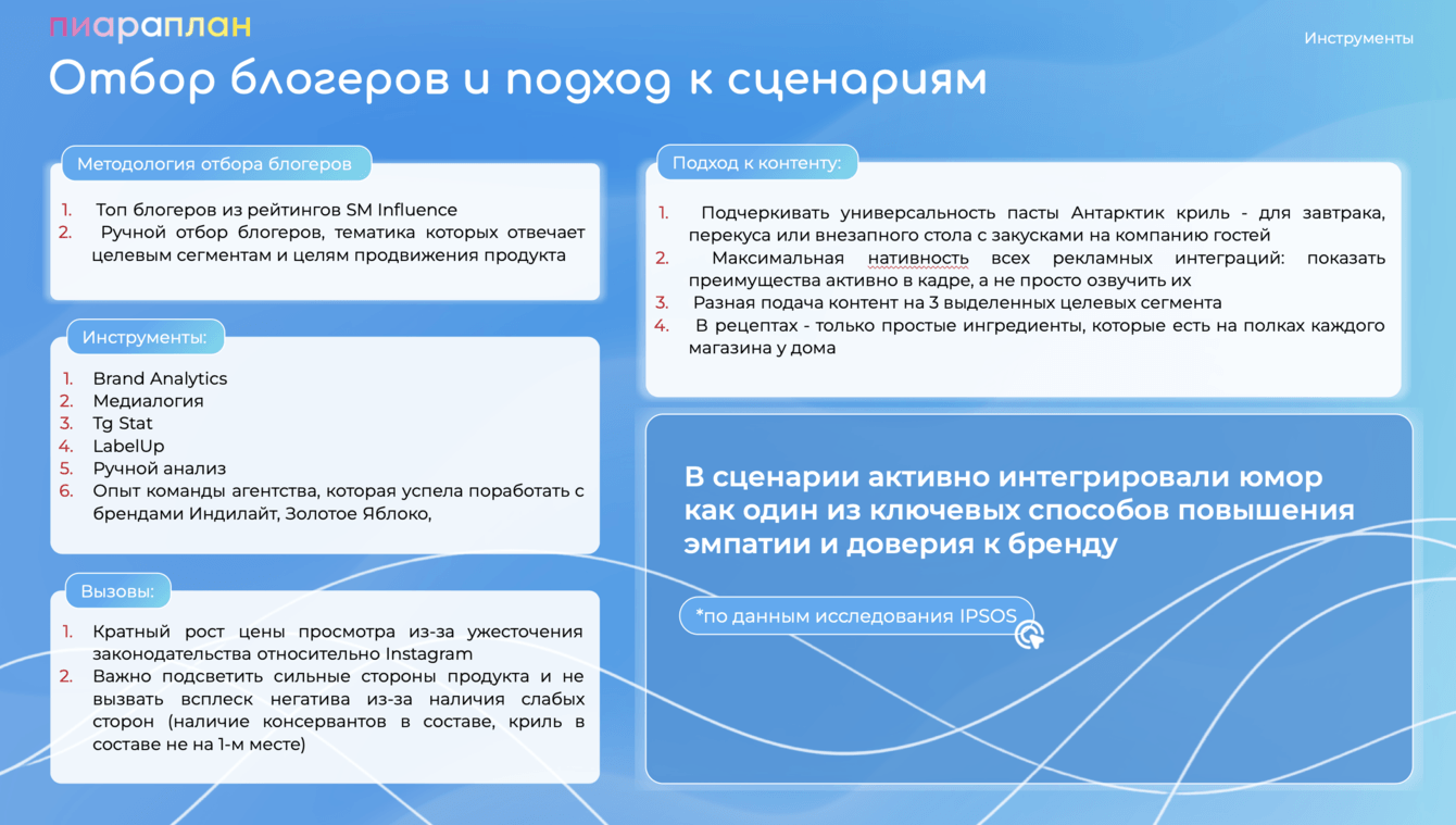 В нем прописали все инструменты работы: от медиа и онлайн-ритейла до блогеров. В соответствии с ЦА и барьерами бренда определили Tone of Voice интеграций и ключевые сообщения, которые нам важно передать аудитории.