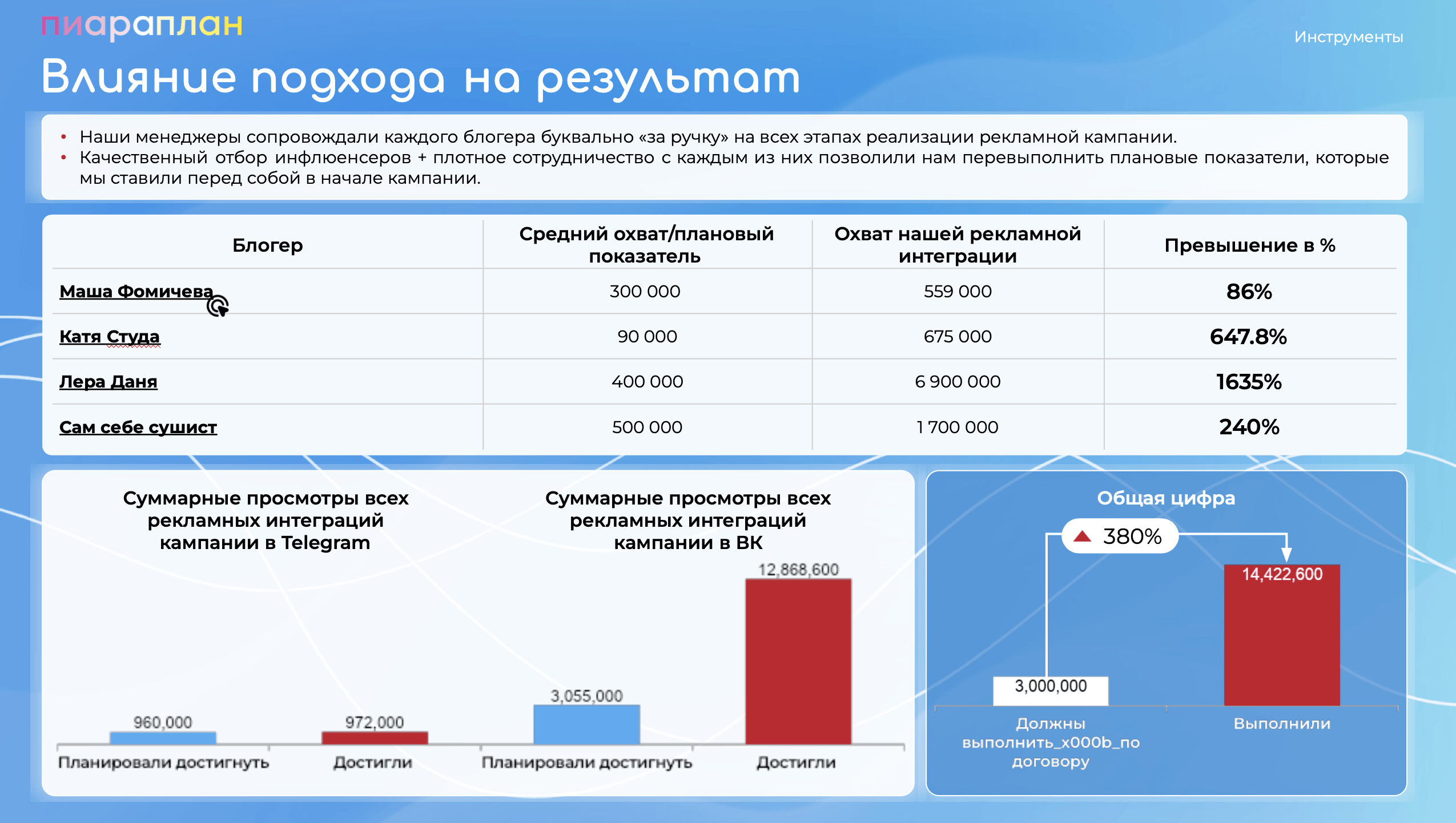 Довольны результатами и тем, что все интеграции вышли в срок и без форс-мажора. Во многом этому обязаны нашему инфлюенс-менеджеру, которая очень ответственно подошла к подбору блогеров - не только с точки зрения их показателей, но и с точки зрения подхода к сотрудничеству с брендами.