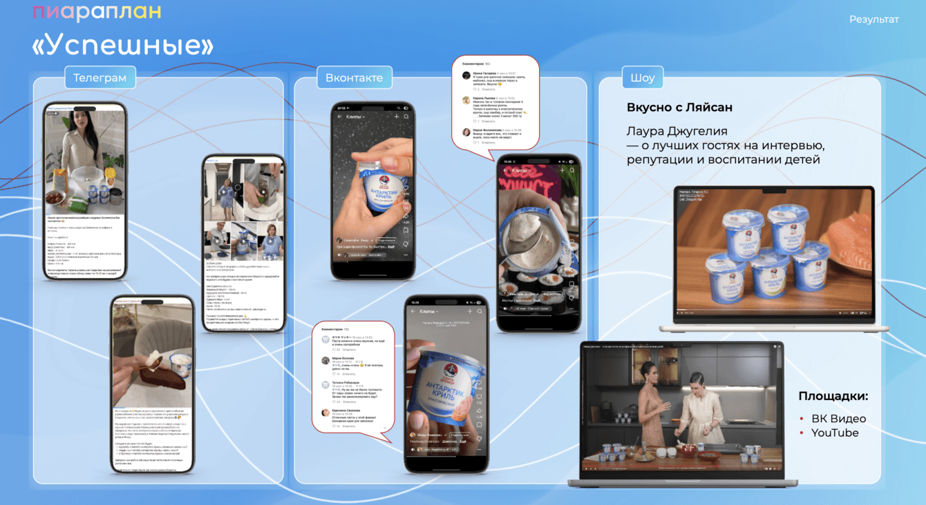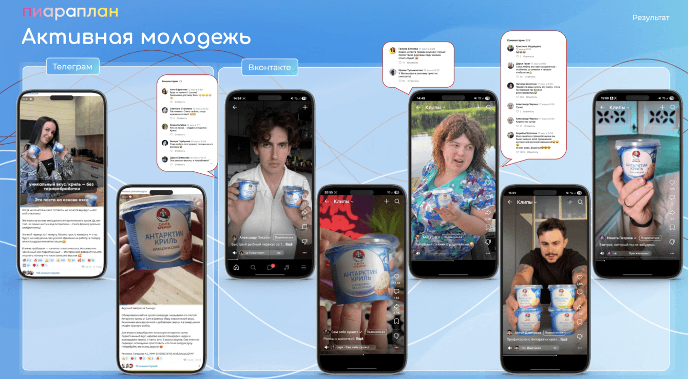Ключевым решением стала кампания с привлечением блогеров, которые интегрировали философию бренда в свой креативный контент. Было реализовано 32 интеграции на платформах VK Клипы, VK Видео (с дублированием на YouTube) и Телеграм.