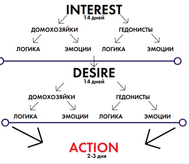 В контентной воронке использовали классическую модель AIDA, где этапом Attention был трафик в аккаунт, вся остальная воронка формировалась уже с помощью контента, так как была задача - прогреть аудиторию. Контент мы раздели на два типа ЦА: домохозяйки и гедонисты и взаимодействовали с ними на двух уровнях: эмоции и логика.