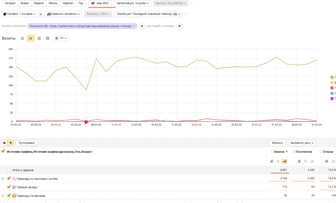 Увеличение посещаемости: Наша статья о лазерной эпиляции привлекает около 4800 посещений в месяц и продолжает расти. Это является значительным увеличением по сравнению с предыдущими показателями и свидетельствует о том, что контент привлекает внимание целевой аудитории.