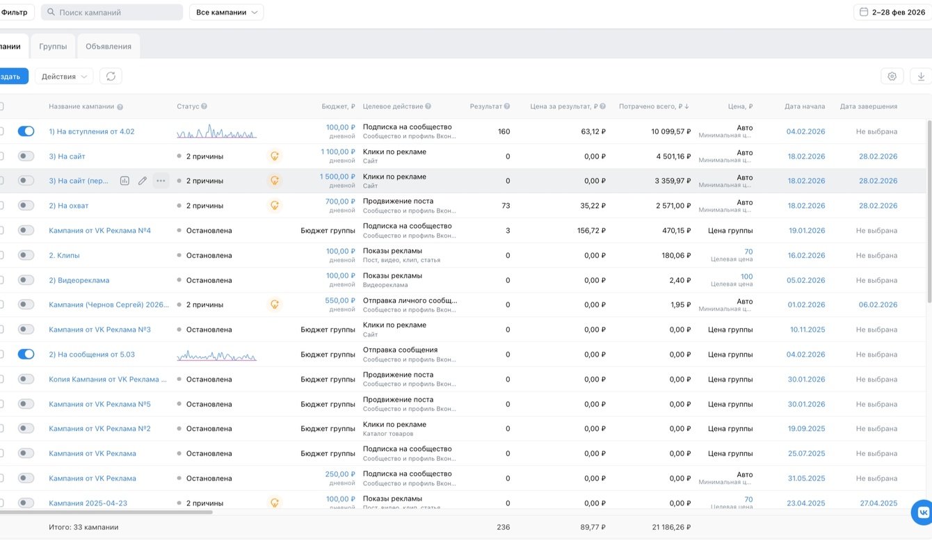 Приветствую! Это уже третий клиент, которому я запускаю рекламу на мероприятия. В феврале 2026 г. ко мне обратился за продвижением руководитель музыкальной группы.