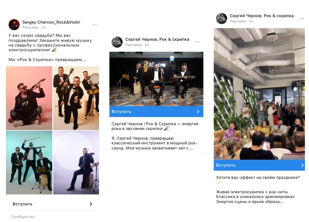 Трафик вели на сообщество и на сайт (покупка билета). В рекламу запускали фото и видео. Выше CTR (кликабельность) была у видео. Под каждую аудиторию делали отдельные офферы и настройки. Тестировали настройки: ключевые фразы, подписчики конкурентов, на подписчиков ивент, на тему свадьба, на HR сообщества, на любителей классической музыки и скрипки и многое другое. Эффективнее всего на цель вступления сработала кампания на учителей, на сайт любителей классической музыки и скрипки.