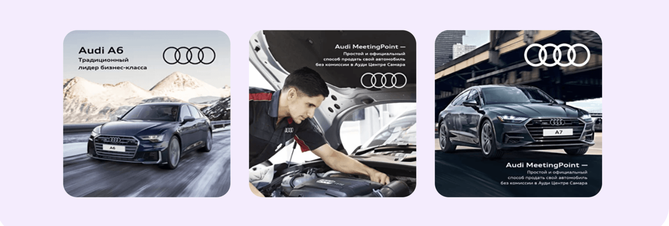 При запуске в соцсетях, так же, как и рекламы на поиске, мы столкнулись с проблемой отслеживания эффективности кампании через сайт, поэтому сразу решили использовать в рекламе только лид-форму.На старте важно было понять, на какие посылы реагирует аудитория, которая покупает Audi.Мы тестировали несколько вариантов: авто в наличии, тест-драйв и стартовая цена. И несмотря на то, что в большинстве объявлений с ценой цифра была больше 5 000 000, основную активность дали именно макеты со стоимостью. Таким образом, у нас автоматически снималась проблема того, что большая часть заявок могут быть нецелевыми, т.к. пользователь сразу видит цену и более осознанно оставляет свои контакты.
