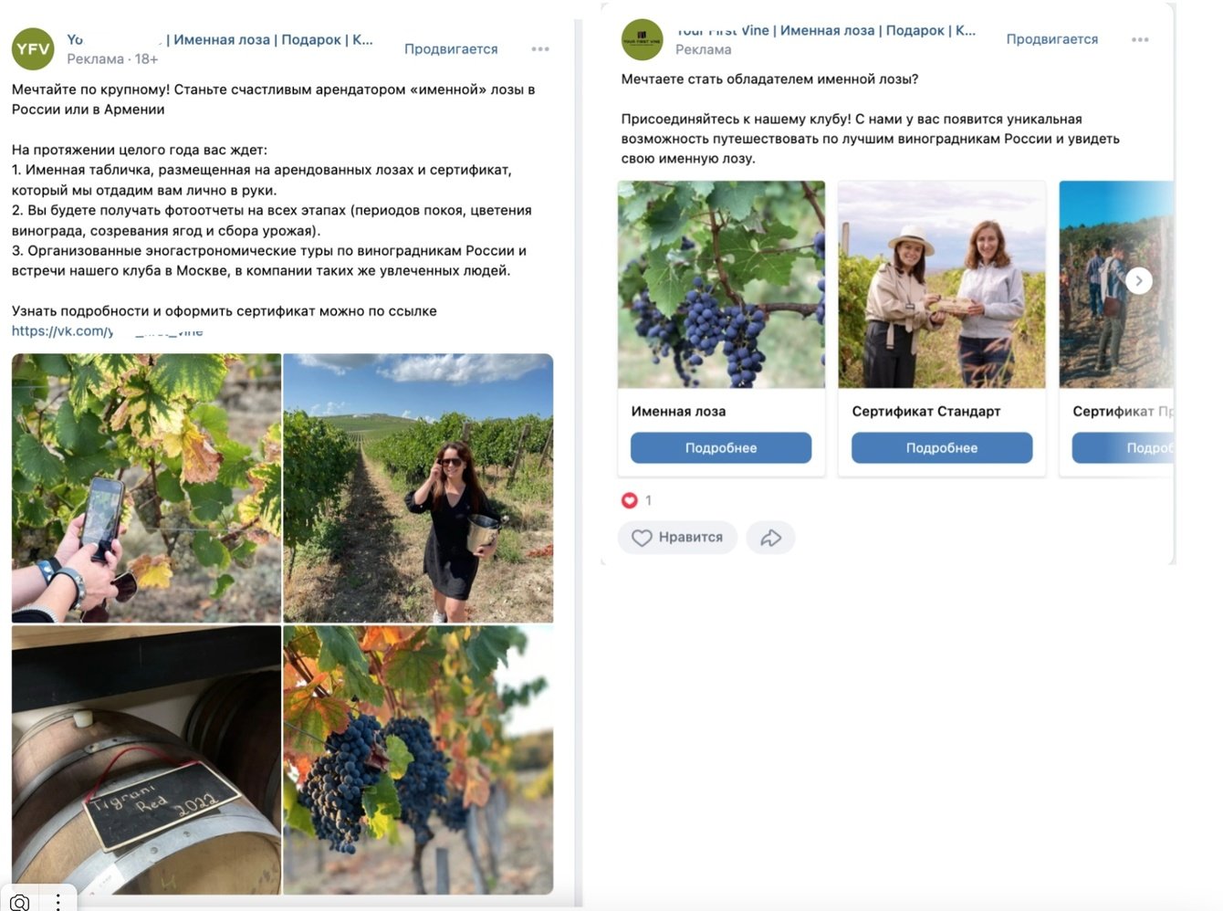 Привет, с тобой таргетолог Любовь!) Сегодня поделюсь своим необычным кейсом из 2023 г. (запускала через маркетинговое агентство) - подарочный сертификат на приобретение аренды именной лозы. Очень необычный подарок и конкурентов в рекламе увидеть так и не смогла, мониторила и через сервесы.