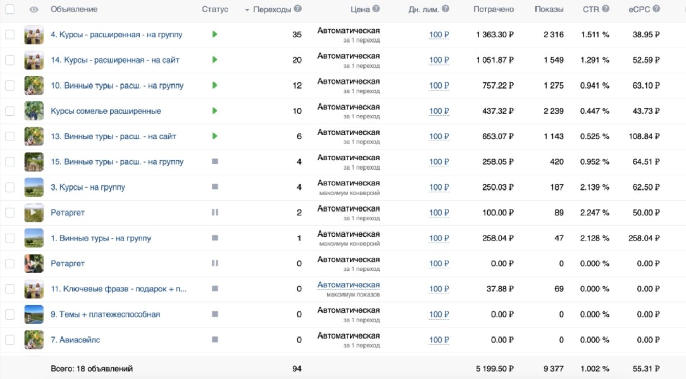 Я протестировала разные форматы - видео, несколько фотографий и формат «Карусель». Лучшая настройка получилась на активных подписчиков групп конкурентов - авторские туры с форматом видео CTR получился 2%, но была высокая стоимость клика.