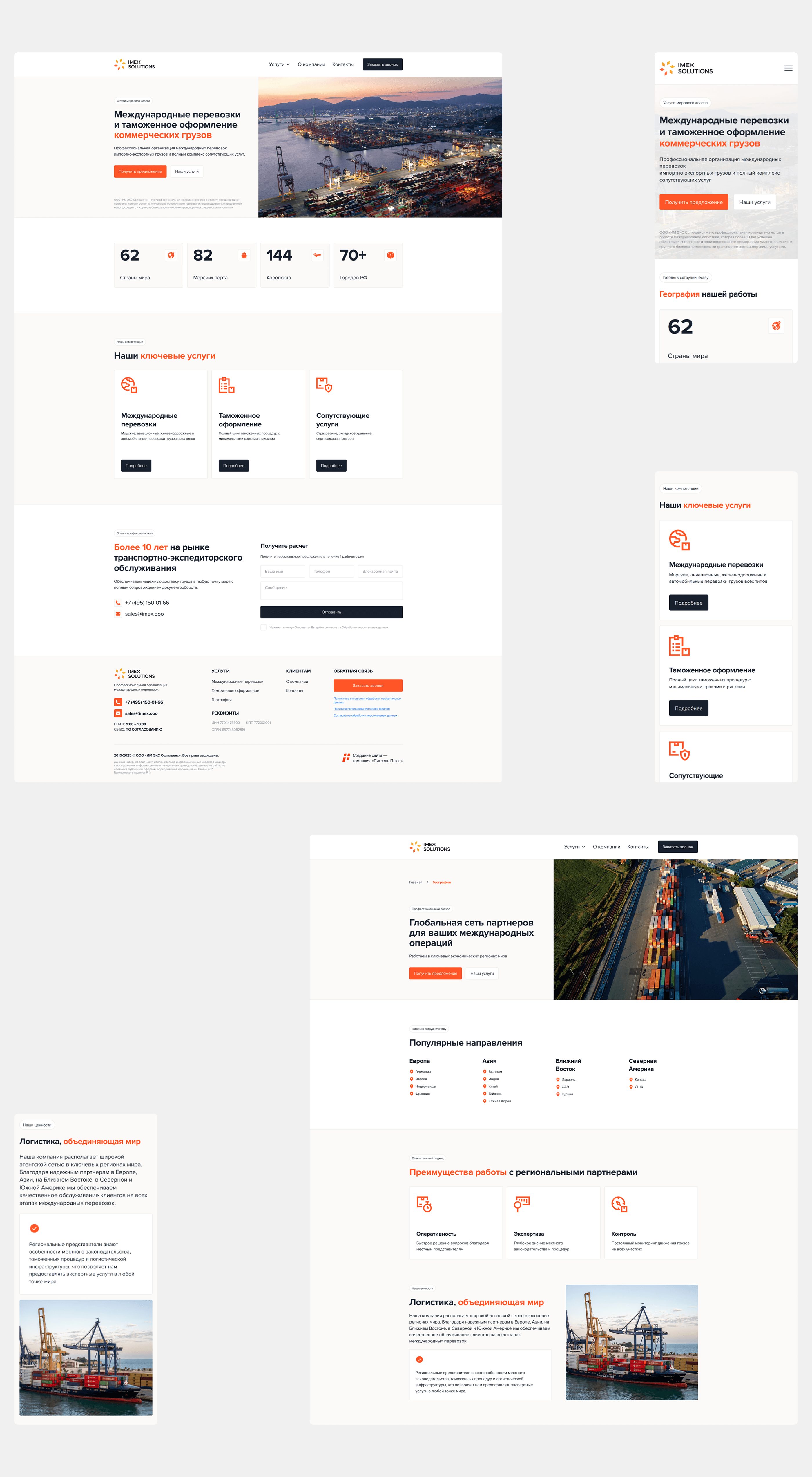 Дизайн: современный корпоративный стиль с акцентом на профессионализм и надежность. Используется сдержанная цветовая палитра (темно-синий, белый, акцентный оранжевый). Качественные изображения контейнеров, портов, логистических операций создают атмосферу масштабной международной деятельности. Минималистичная структура с четкой навигацией и понятными call-to-action элементами.
