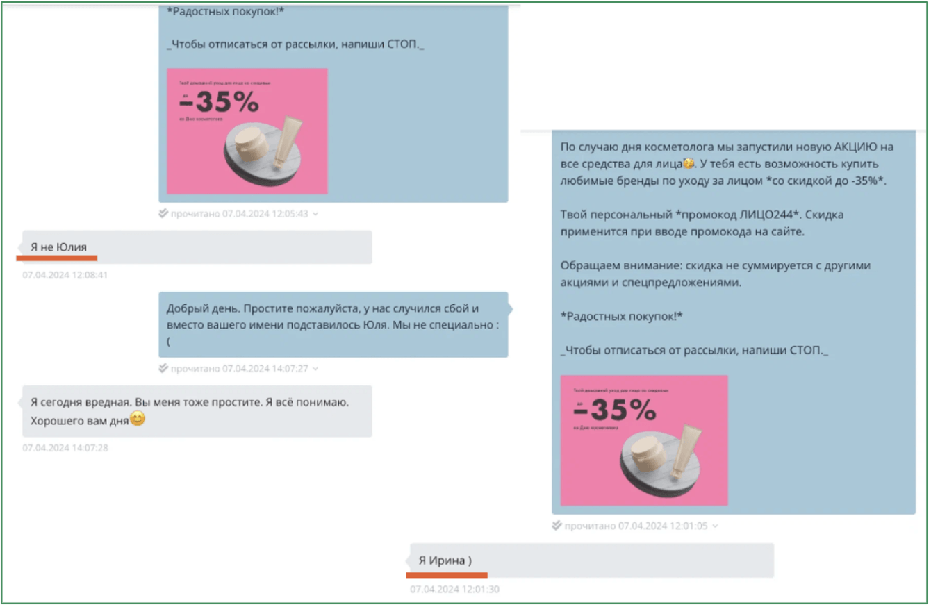 5. Сбой в именах клиентов. Кроме триггерных сценариев тестировали и массовые отправки по отдельным сегментам аудитории. Из-за технических особенностей в названиях полей в личном кабинете произошла ошибка, и всему сегменту ушло сообщение с обращением «Юлия». Получили шквал ответных сообщений в стиле “Я не Юля!” и вручную отвечали на много сообщений, извиняясь за ошибку. И хотя в реакция клиентов была доброжелательной, потратили много времени.
