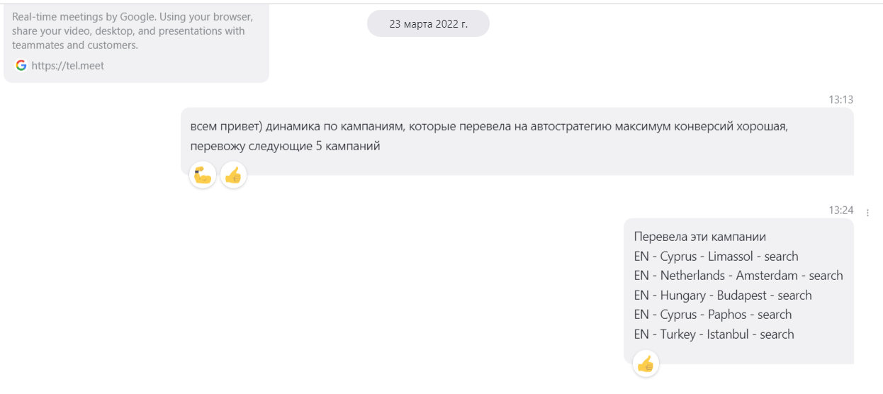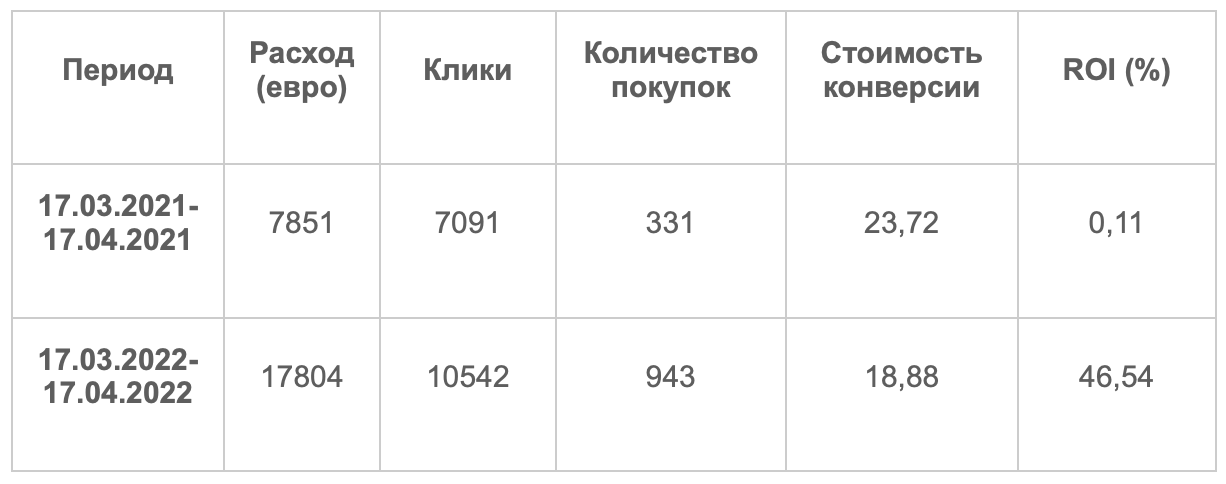 Сравнивая период с 17.03.2021 - 17.04.2021 и равный период 17.03.2022 - 17.04.2022 мы увеличили бюджет в 2 раза. Количество конверсий при этом выросло в 3 раза.