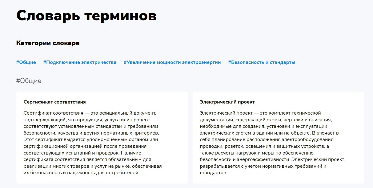 2) Словарь терминов, где подробно объясняются технические понятия энергетической отрасли. Этот раздел значительно увеличил тематический объём сайта и улучшил внутреннюю перелинковку.