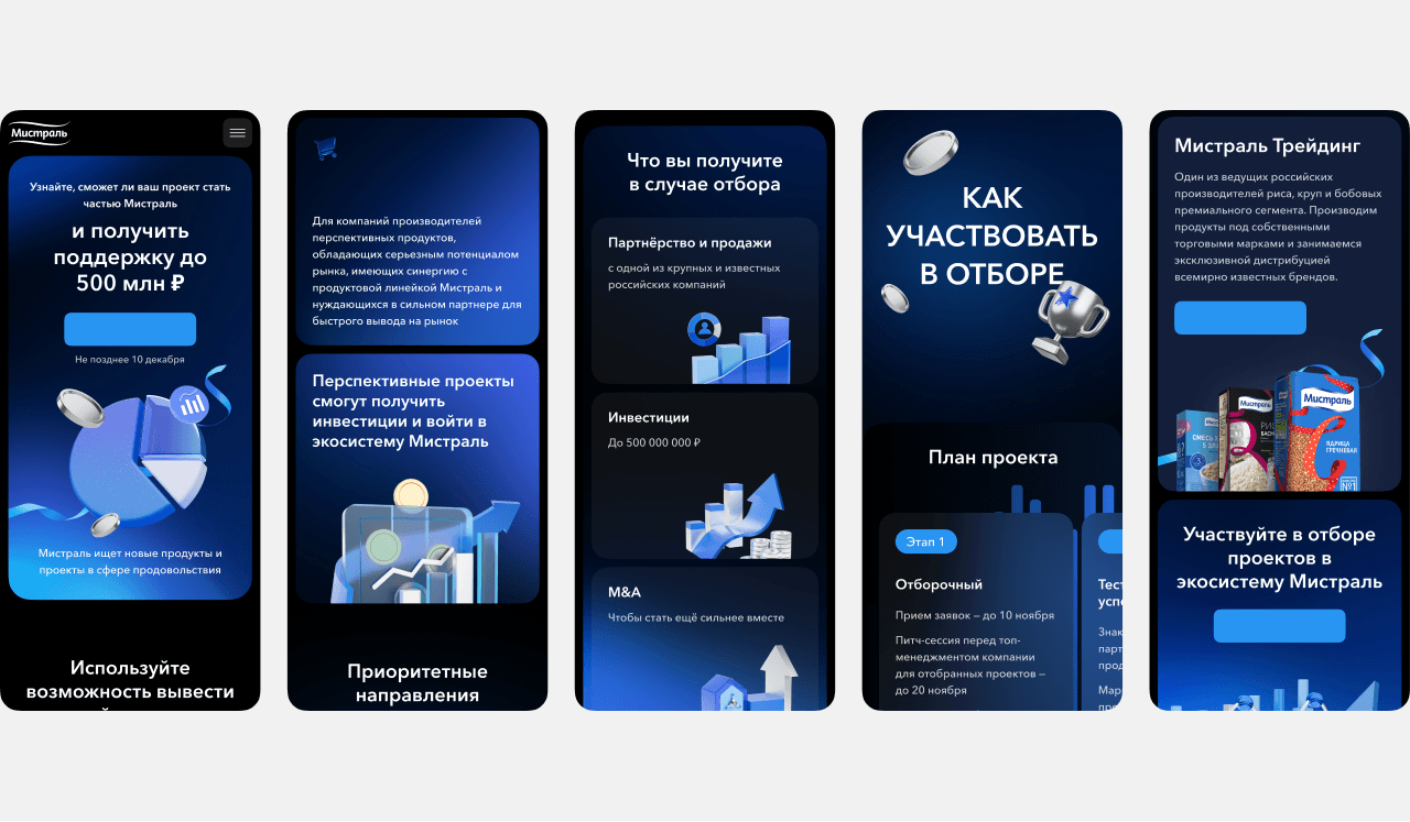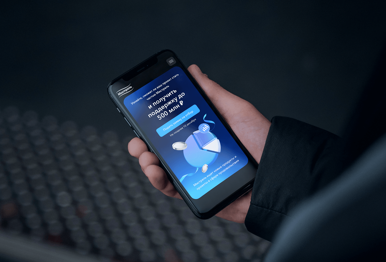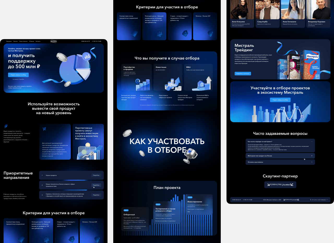 В «Мистраль Трейдинг» был запущен инвестиционный проект, по причине готовности к расширению продуктовых линеек и выходу в новые категории. На этапа скаутинга был необходим лендинг для сбора заявок от претендентов, который расскажет суть проекта, условия участия и критерии отбора.