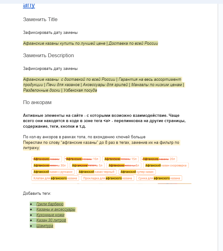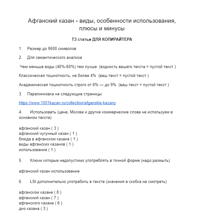 На первом шаге были сформированы подробные технические задания на создание серии информационных статей и материалов, полностью отвечающих интересам целевой аудитории - потенциальных покупателей казанов.