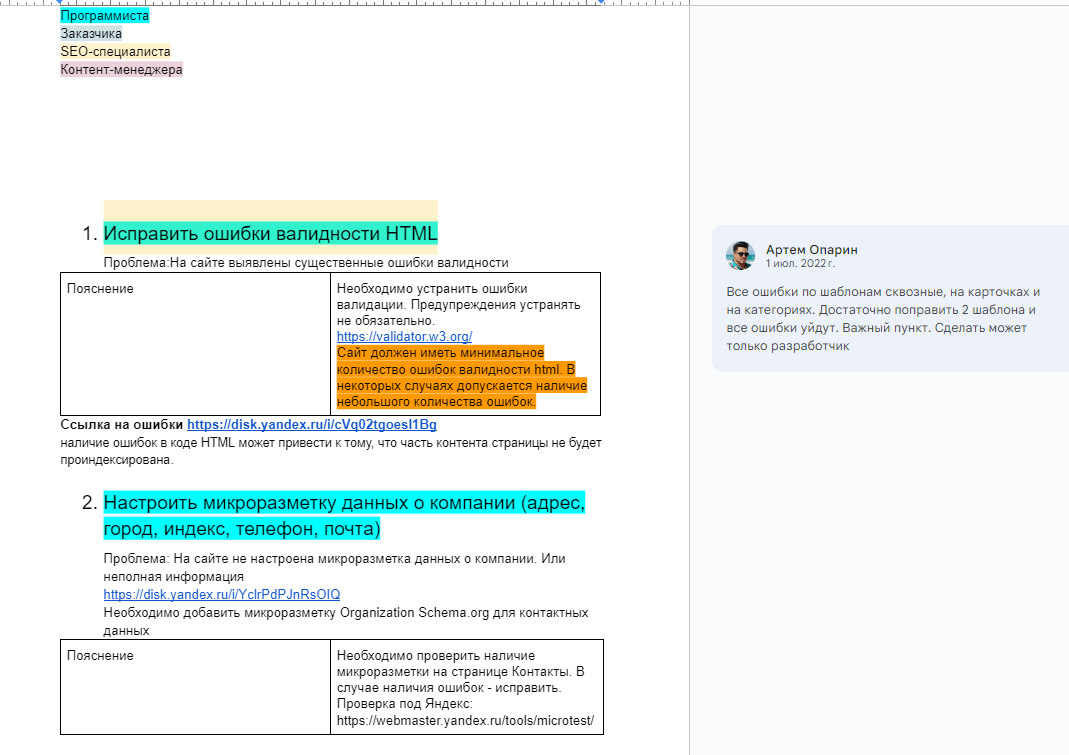 В результате были выявлены многочисленные недочеты: дублирование контента, неоптимизированные заголовки и метаданные, некорректная файловая структура, проблемы с распределением ключевых элементов в HTML-коде и целый ряд других моментов, негативно влияющих на индексацию и ранжирование сайта.