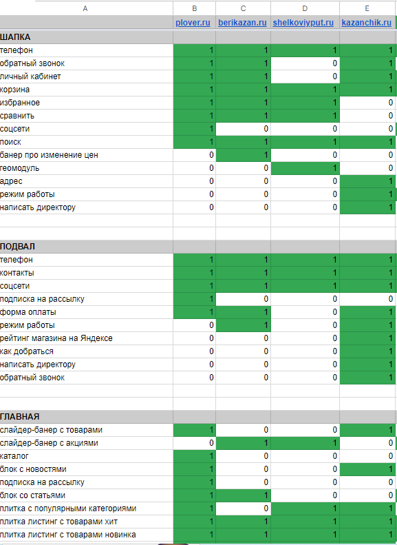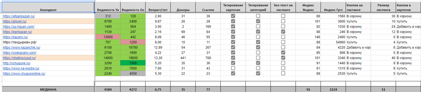 Дополнительно были исследованы молодые, но уже успешно ранжируемые сайты из ТОП-10 поисковой выдачи по Москве в тематике "Казаны". Мы изучили лучшие практики юзабилити и структурирования информации на данных ресурсах, эффективные решения по категоризации товаров и представлению ключевого контента.