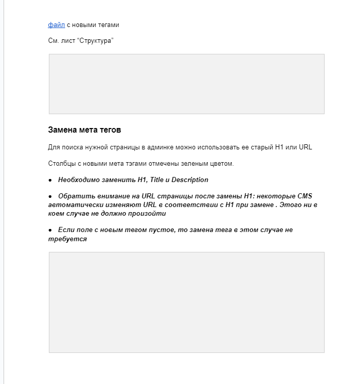 В ТЗ прописывалось точное распределение ключей и связанных с ними слов по заголовкам, подзаголовкам, основному тексту, спискам и другим структурным элементам страниц категорий. Определялась плотность размещения ключевых терминов для максимальной релевантности контента поисковым запросам.