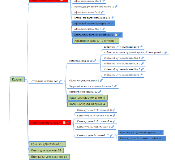 В первую очередь была сформирована полноценная структура товарных категорий. Цель - максимально широко раскрыть ассортимент интернет-магазина казанов и обеспечить охват всего запросного индекса по данной нише в выдаче поисковиков.