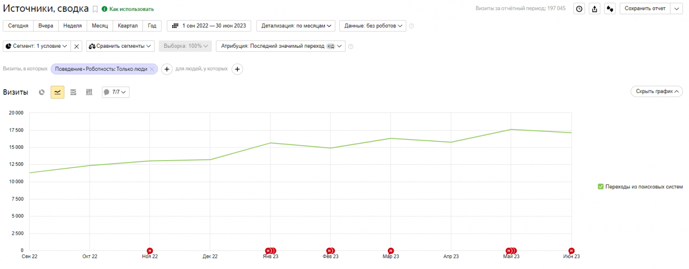 По данным инструмента веб-аналитики Яндекс.Метрика, уровень трафика из поисковой системы Яндекс демонстрировал стабильный и впечатляющий рост на протяжении всего периода продвижения: