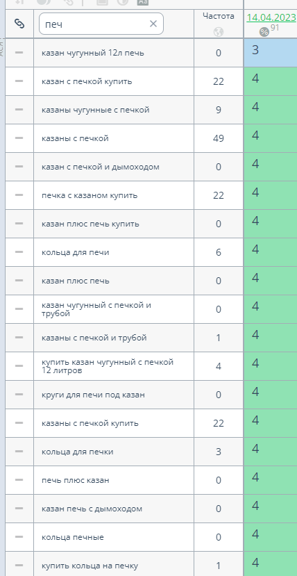 На следующем этапе для каждой рабочей страницы, уже получающей трафик из поиска, были проанализированы позиции по активным запросам. Если позиция по какому-либо ключевому слову была ниже ТОП-10, то мы приступали к дополнительной SEO-оптимизации данной страницы: