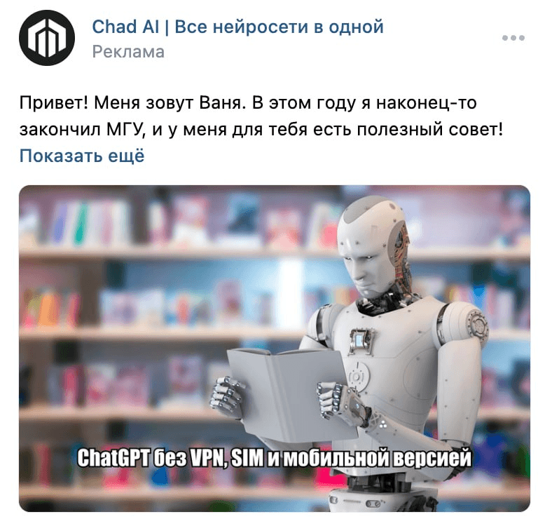 Создали креативы. В креативах сначала использовали изображения роботов и отражали преимущества сервиса: для использования не нужен VPN и сим-карта. Вели сторителлинг от лица студентов с рекомендацией воспользоваться сервисом.