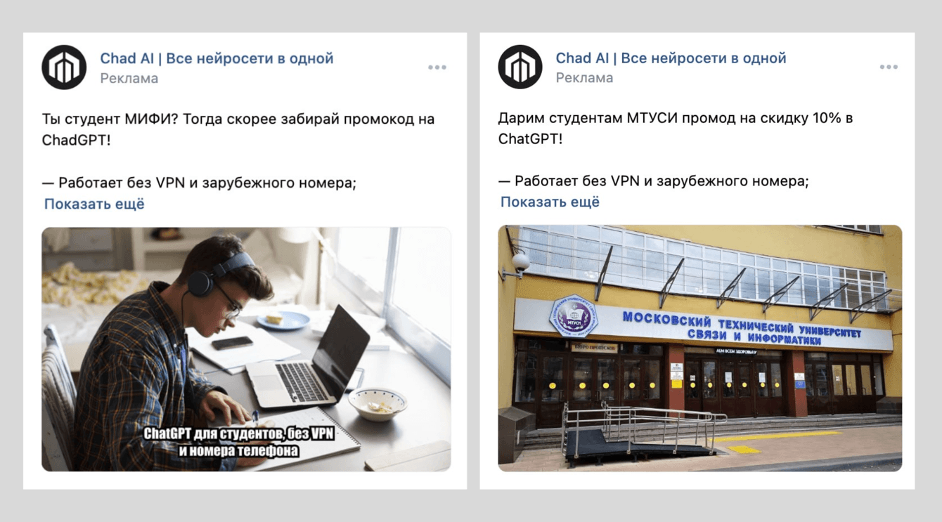 В таких креативах была низкая конверсия, поэтому решили адаптировать изображения под ЦА. Добавили реальные фото вузов под каждое сообщество и фотографии студентов. Также в текст креативов добавили промокод, что должно было улучшить конверсию.