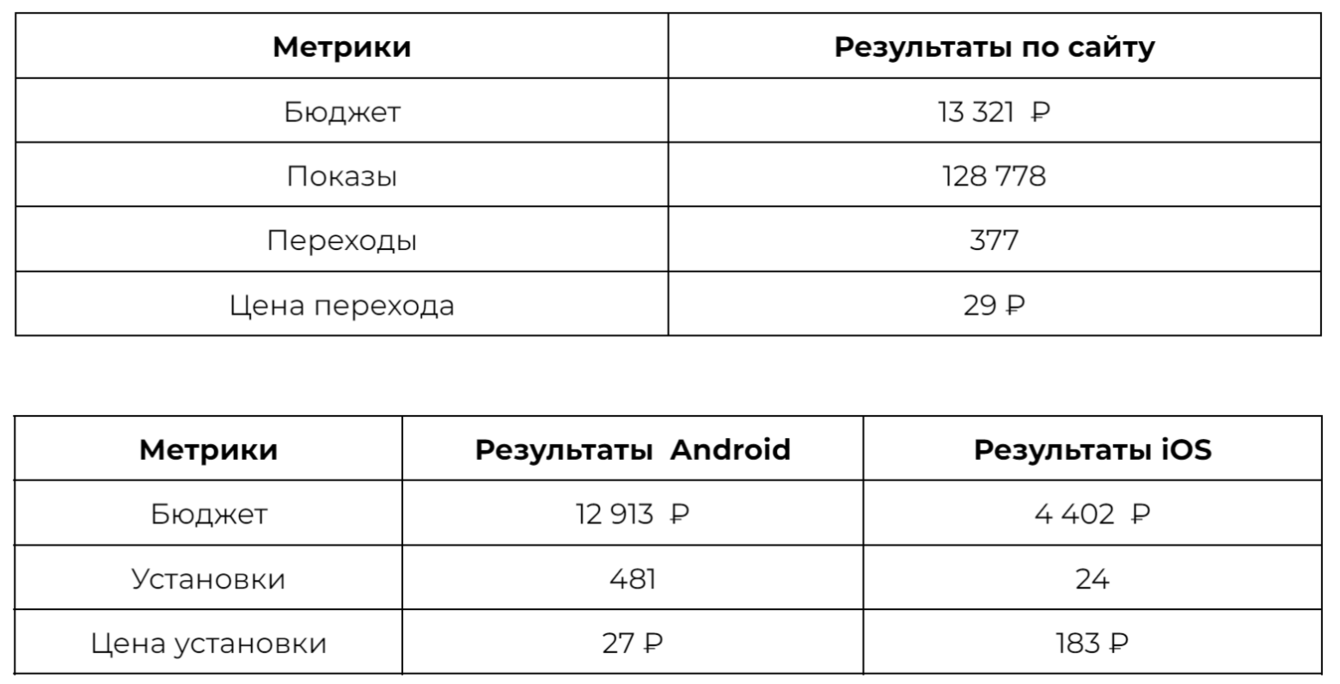По результатам кампания себя не оправдала. Затрат требовалось больше, чем на фотокреативы, а переходы и установки были дороже. Это могло произойти по причине таргетинга на широкую аудиторию: продукт был неактуален. Поэтому отказались от гипотезы и вернулись к креативам с изображениями.