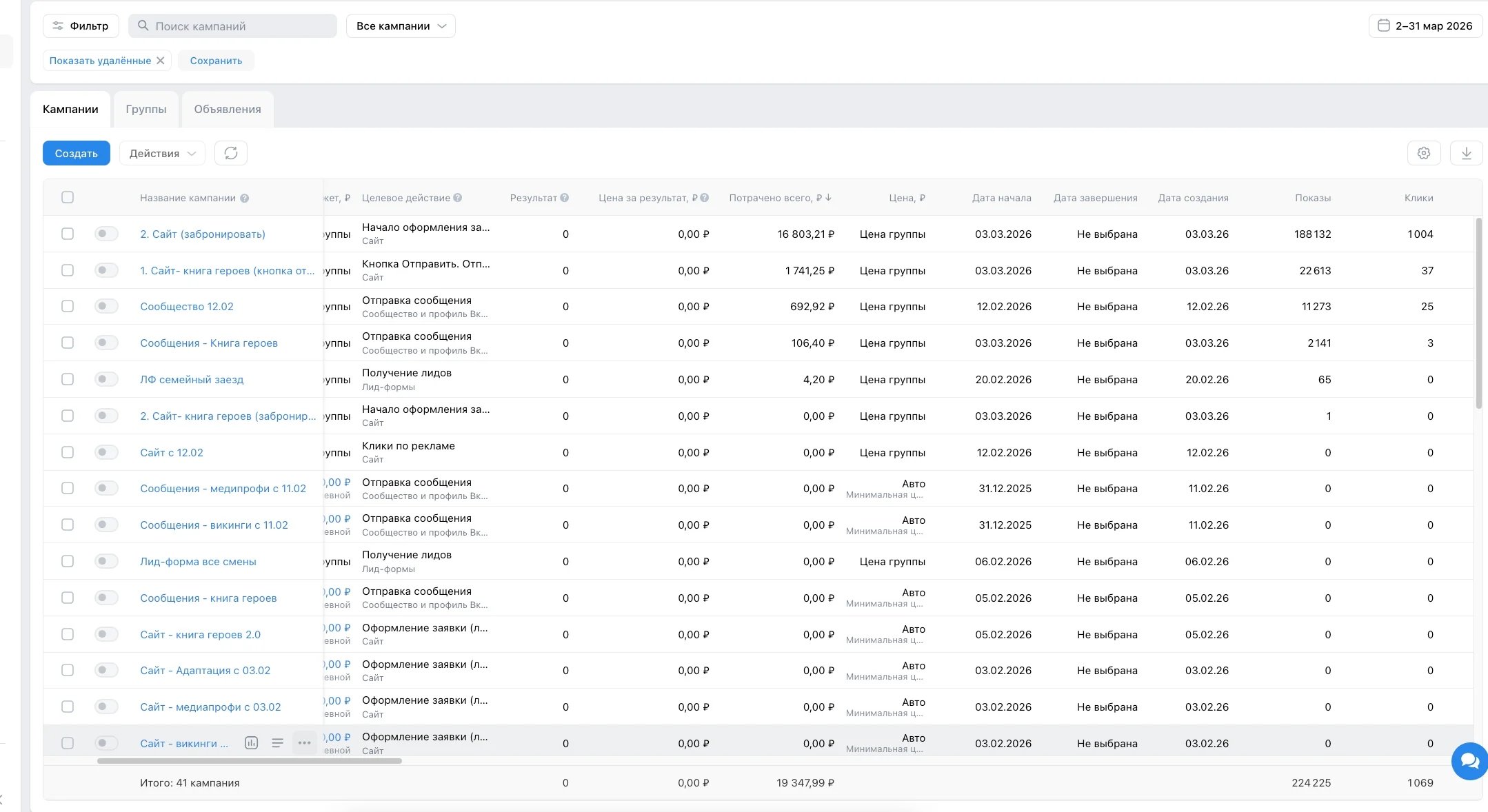 Цель рекламы — переходы на сайт, бронь смен. Рекламный бюджет — 50 000 р.