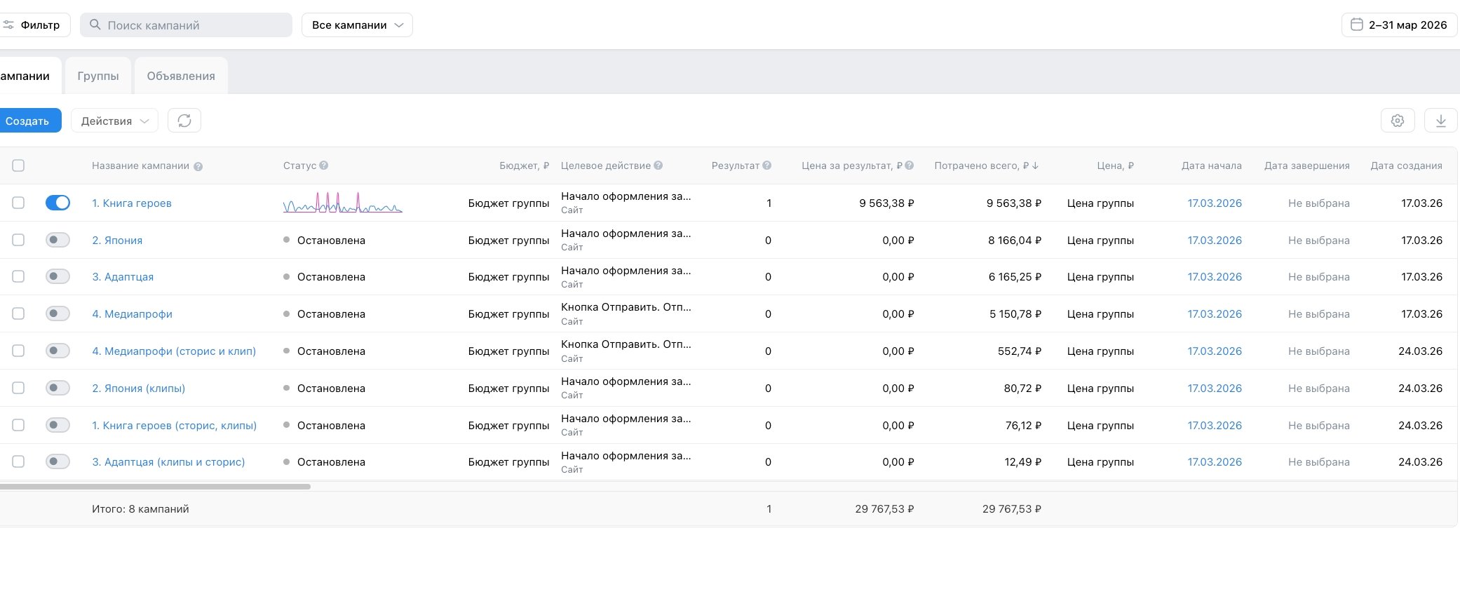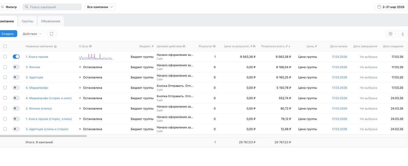 После стратегии, я начала подготавливать креативы и собирать настройки. Создала несколько кампаний.