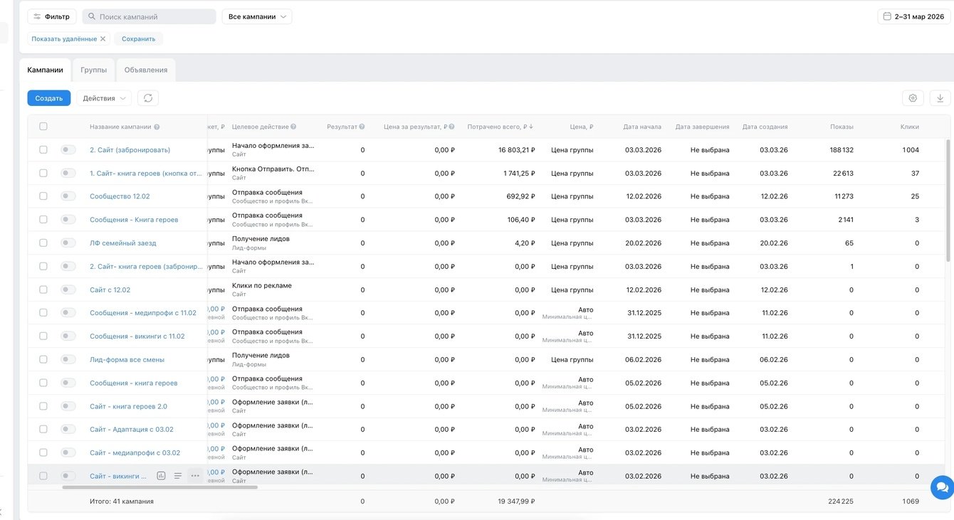 Добрый день! Весной 2026 г. ко мне обратился клиент — детский лагерь. Лагерь круглый год проводит тематические смены для детей и подростков. Ранее рекламу запускало маркетинговое агентство, но потом обратились ко мне.