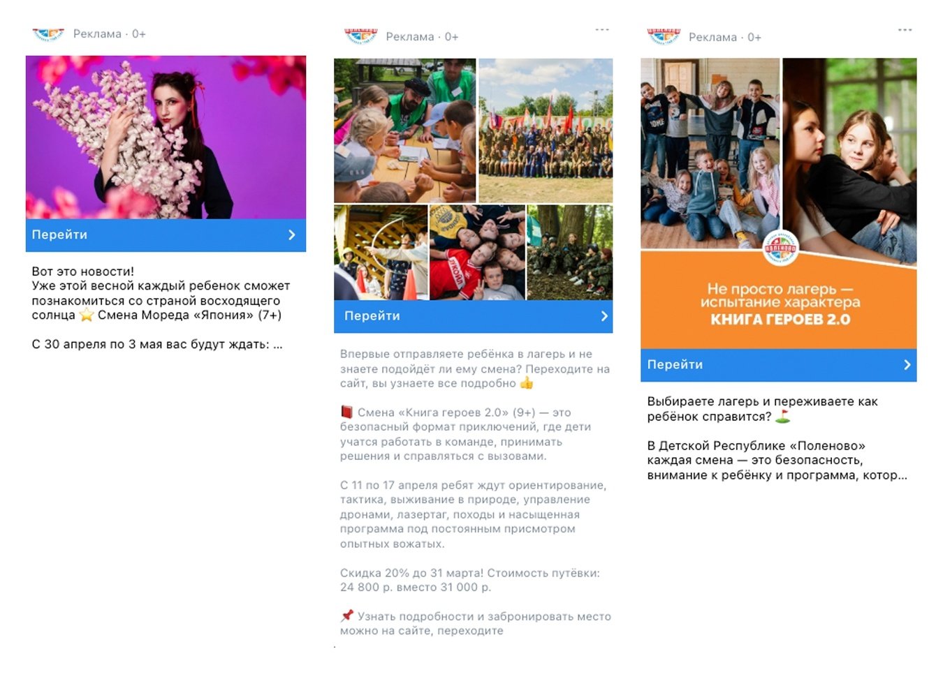 За месяц протестировали фото, макеты и видео. Настройки — ключевые фразы «детский лагерь», «лагерь смена весна» итд; тема родители; подписчики конкурентов; активные подписчики конкурентов; тематические сообщества (детские игровые, центры, секции и многое другое); автозаинтересованная аудитория и ретаргет. Использовала разные форматы: слайдер, коллаж, 1 фото. Реклама показывалась на площадках: лента, боковая колонка и также тестировала сторис и клипы.