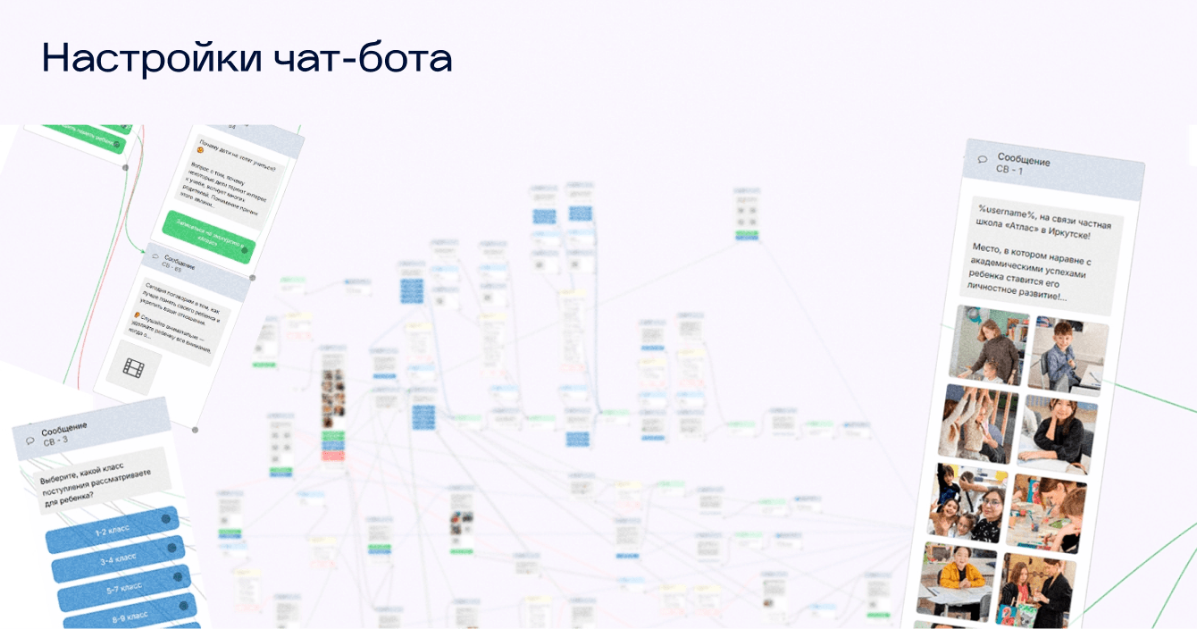 Выбор школы — это решение, которое родители редко принимают быстро. Переход ребёнка в другое учебное заведение чаще всего происходит либо в начале четверти, либо раз в полгода. По нашему опыту и данным клиента, средний цикл принятия решения о смене школы составляет 2–3 месяца. Клиент обратился к нам ещё в декабре 2024 года, то есть примерно за 6 месяцев до начала учебного года 2025–2026. Такой временной запас позволял отказаться от агрессивных рекламных кампаний, направленных на быстрые заявки. Вместо этого мы сделали ставку на формирование базы потенциальных родителей и постепенный прогрев аудитории через контентные воронки и ретаргетинг. В качестве основной посадочной страницы для рекламы во ВКонтакте был выбран чат-бот, который: — знакомил родителей с форматом обучения и преимуществами школы; — показывал отзывы и примеры образовательной среды; — отвечал на частые вопросы о формате обучения. Дополнительно была настроена цепочка догоняющих сообщений, которые отправлялись подписчикам с интервалами 7, 10, 21 и 50 дней, постепенно возвращая аудиторию к вопросу выбора школы. Такой подход позволял постепенно формировать доверие к школе и возвращать родителей к диалогу в момент, когда они были готовы рассматривать переход ребёнка.