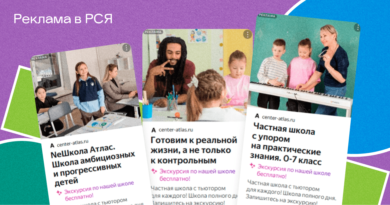 В рекламной сети Яндекса (РСЯ) есть возможность настраивать показы как по ключевым запросам, так и по интересам и социально-демографическим характеристикам аудитории, которые предоставляет Яндекс. Мы использовали два основных подхода к таргетингу: — показы по ключевым запросам, связанным с частным образованием; — показы по интересам, в том числе на аудиторию родителей с детьми в возрасте от 6 до 14 лет.