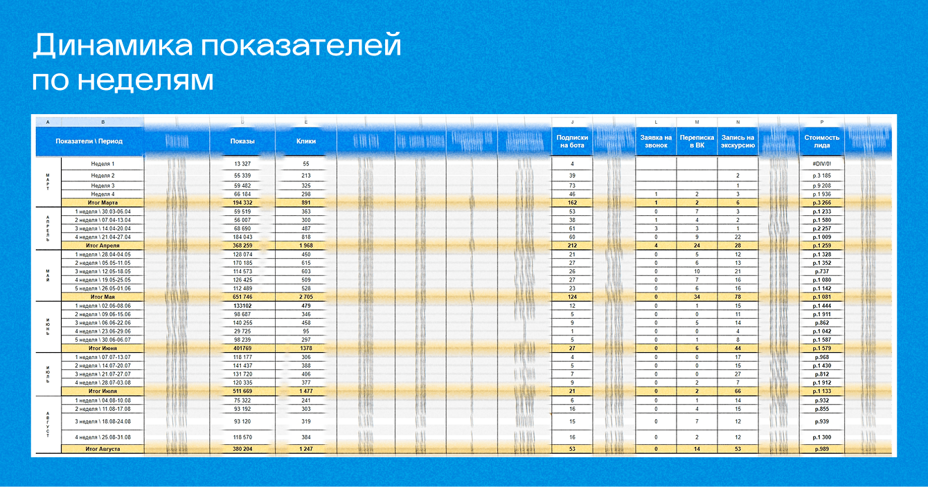 Чтобы следить за динамикой проекта и понимать всю картинку по РК, со своей стороны готовили статистику по недели, клиент давал обратную связь по лидам - с точки зрения квал / неквал: