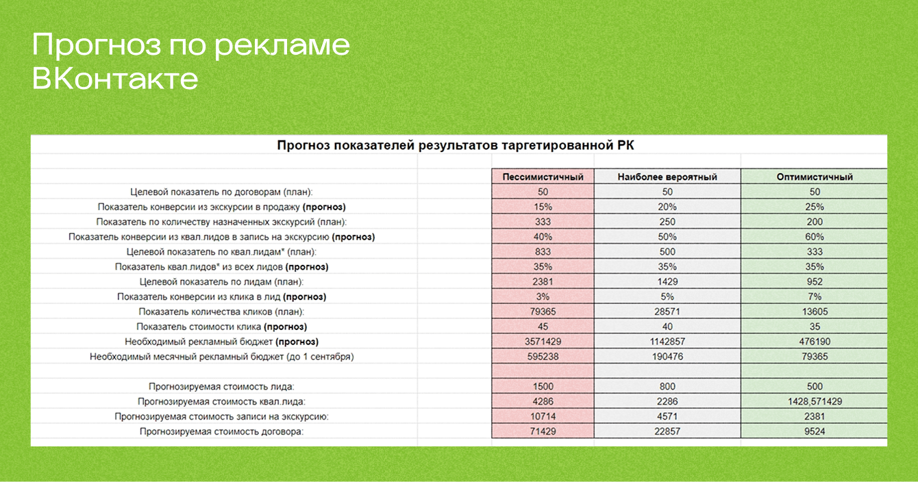 Перед запуском Яндекс.Директ мы также рассчитали прогнозную экономику воронки, чтобы зафиксировать реалистичные ожидания по количеству заявок, квалифицированных лидов и стоимости договора.