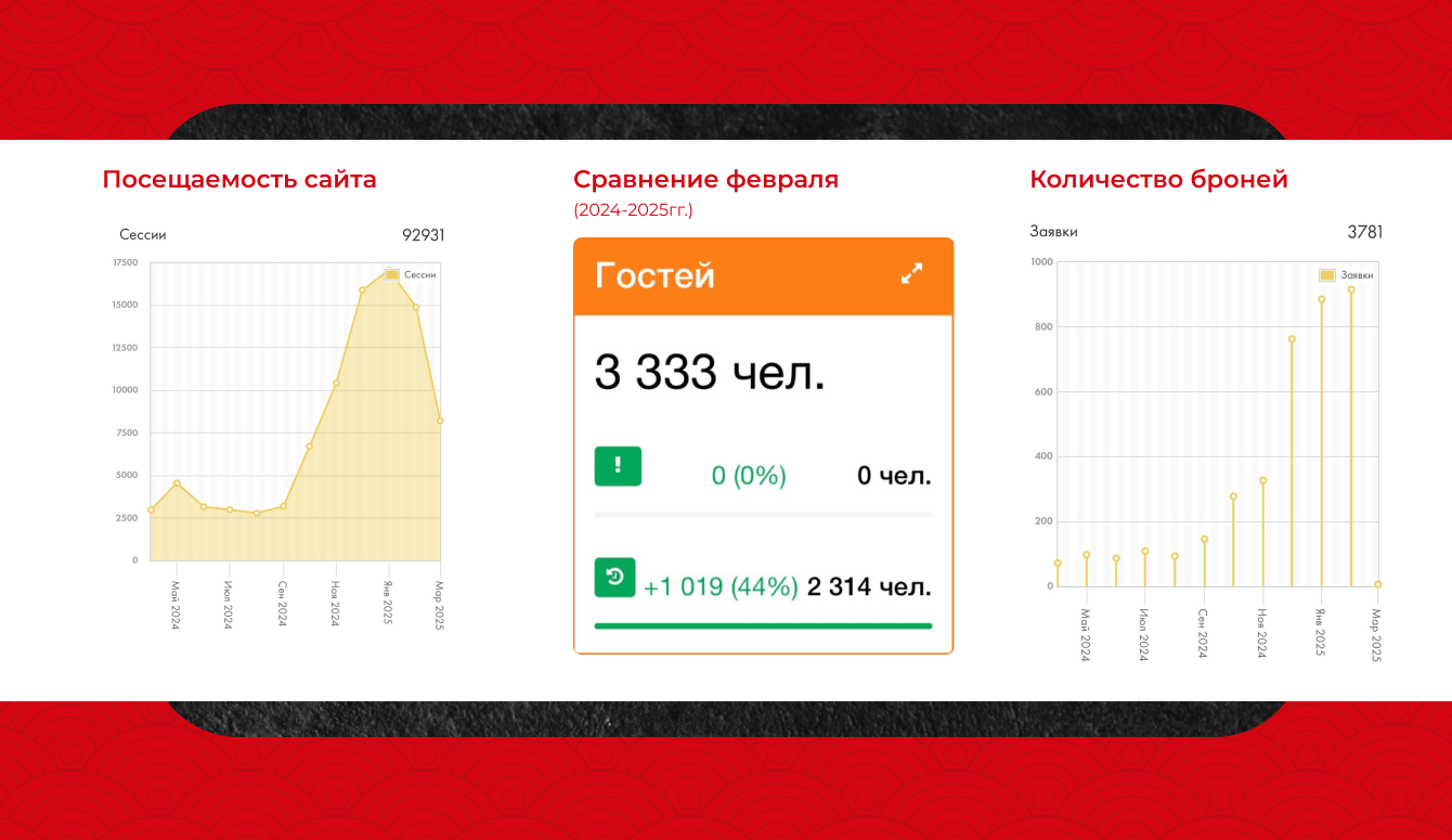 За шесть месяцев активной работы по запуску рекламных кампаний нам удалось не только существенно повысить узнаваемость заведения, но и увеличить показатели ключевых конверсий. Например, если мы сравним период с 01.01.2025 по 26.03.2025 с аналогичным периодом прошлого года, то увидим следующие результаты: