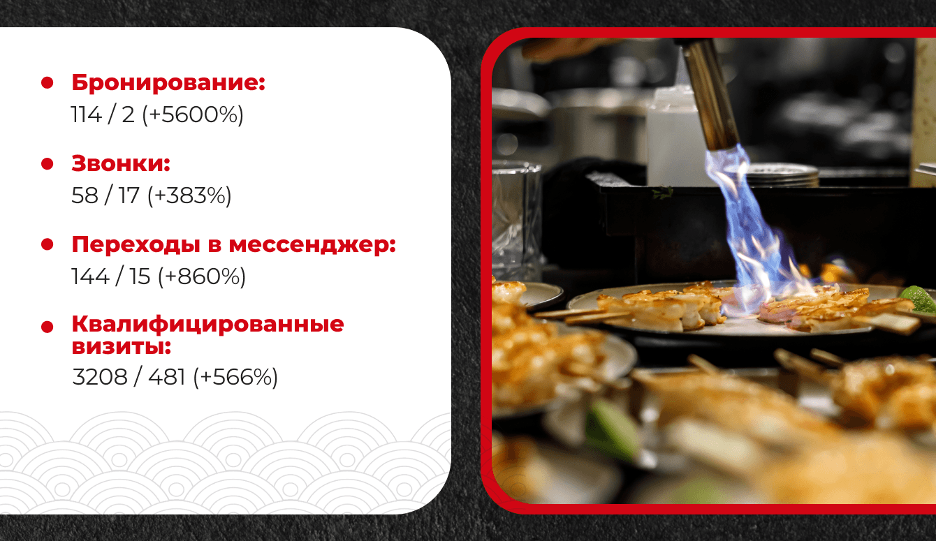 Главной «изюминкой» с точки зрения трафика стал переход на оптимизацию по промежуточным конверсиям. Также можно выделить переход от фокуса на «заказ в моменте», на повышение узнаваемости заведения, что крайне положительно отразилось на общей динамике заказов.
