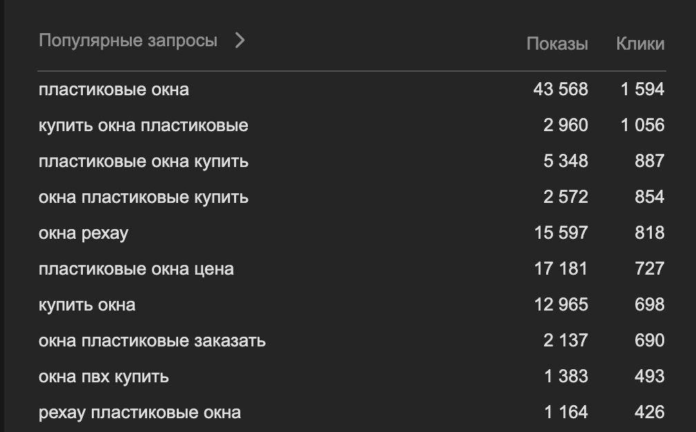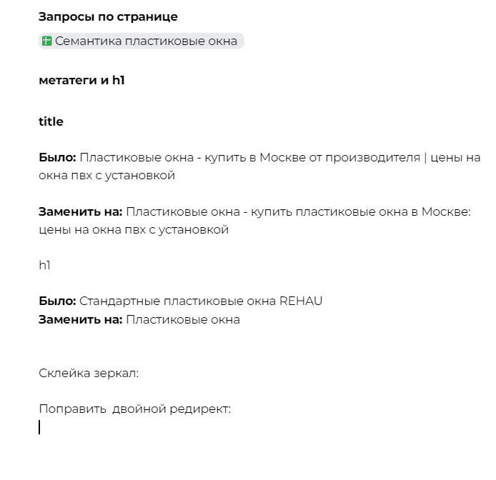 Мы сформировали полный список целевых запросов под каждую категорию товаров, включая коммерческие и информационные (например, «окна москва заказать», «пластиковые окна»).