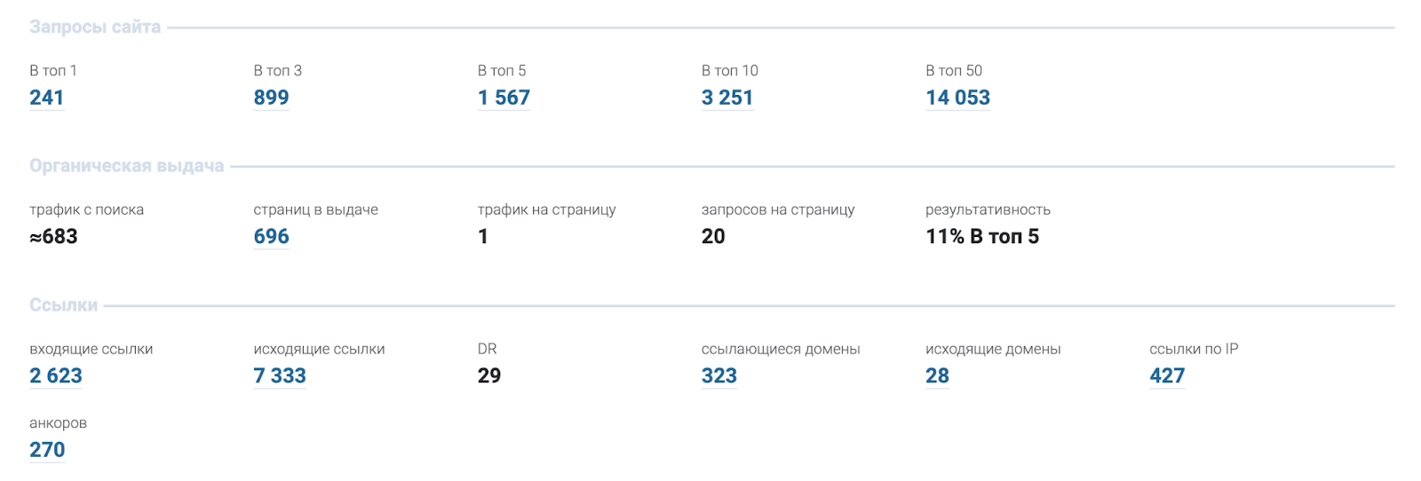 - Ключевые слова в ТОПе: на момент старта в видимости Google находилось 1 200 запросов, а в Яндексе — около 2 000. Сегодня это 14 053 запроса в Google (+1071%) и 8 883 в Яндексе (+344%).