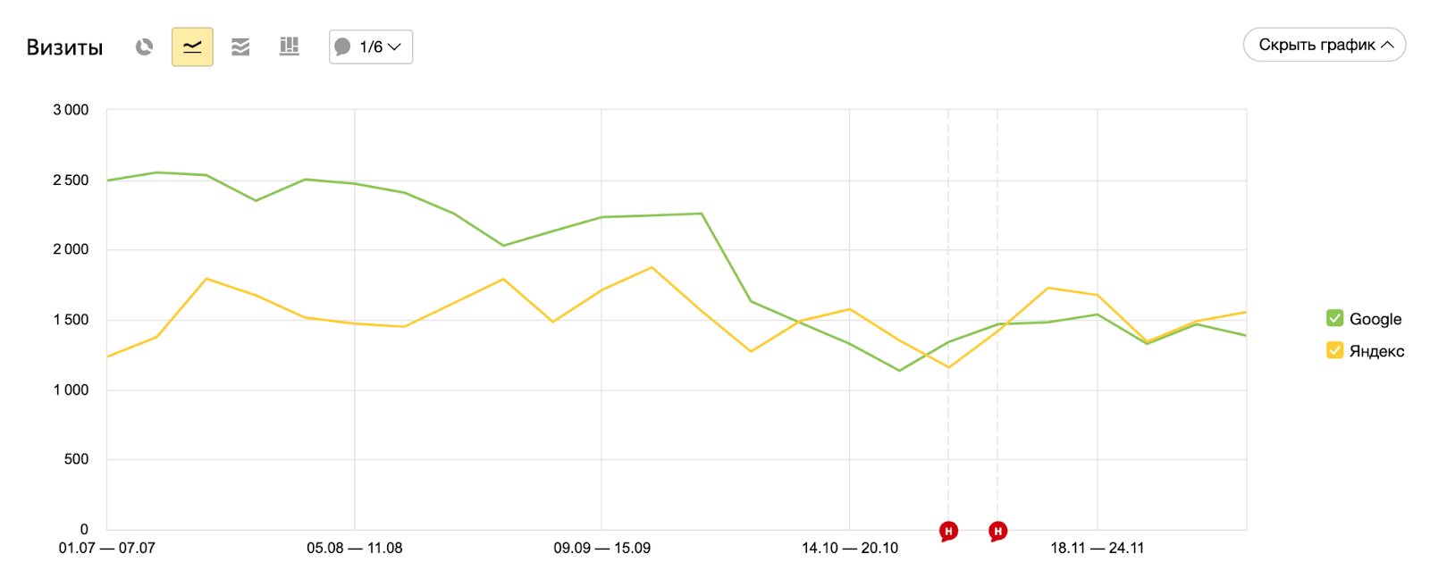 В течение работы Яндекс несколько раз обновлял алгоритмы, что могло бы негативно сказаться на результатах. Однако благодаря постоянному мониторингу и корректировке стратегии мы удержали позиции сайта. После каждого обновления показатели восстанавливались в течение нескольких недель без значительных потерь.