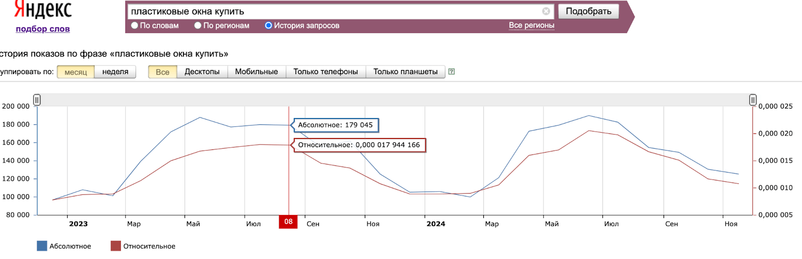 Наибольший спрос на пластиковые окна приходится на сентябрь (179 000 запросов), тогда как в декабре этот показатель снижается до 105 000 запросов, что соответствует падению на 40%.