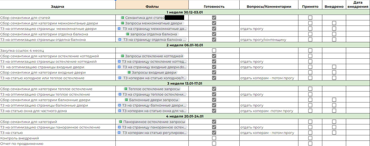 Составили еженедельный план работ на 6+ месяцев для прозрачной отчетности и отслеживания внедрений (на картинке 1 из месяцев):