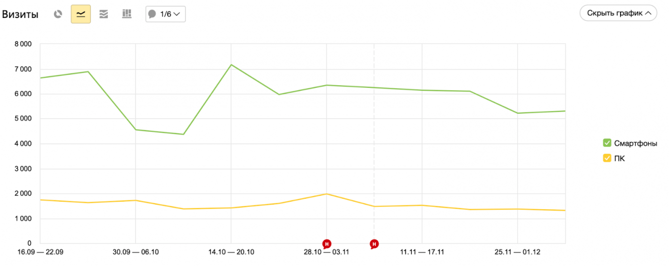 Аналогичная динамика прослеживается и в посещениях: в сентябре сайт посетило 8 374 человека, а в декабре — 6 626, что составляет падение на 20%. Тем не менее, внедренные нами улучшения позволили компенсировать сезонные колебания и сохранить стабильный поток заявок.