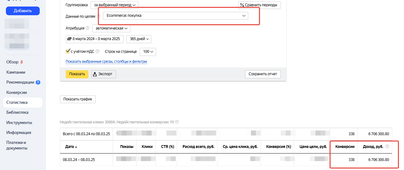 Ну что ж, перейдем к самому интересному. За год было получено с Директа 338 заказов на сумму 6,7 млн рублей, с учетом того, что вложили в 3 раза меньше! Реальная сумма чуть больше, ибо здесь по части покупок учитывается ценность из настроек стратегии.