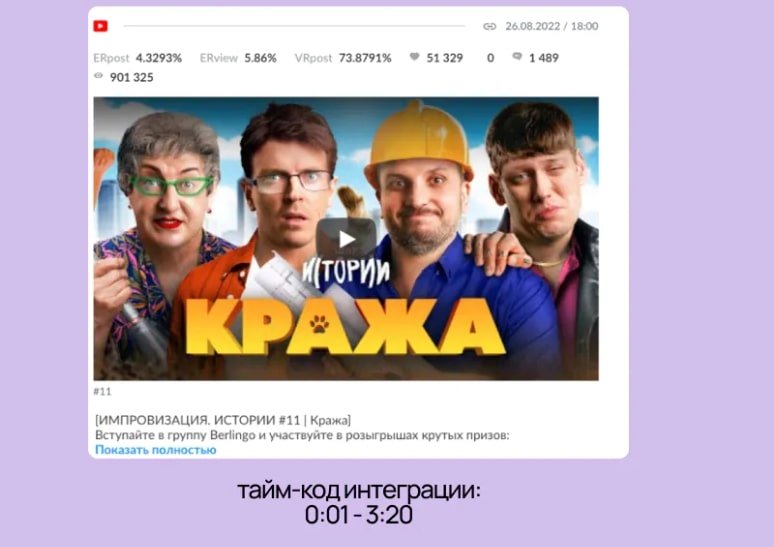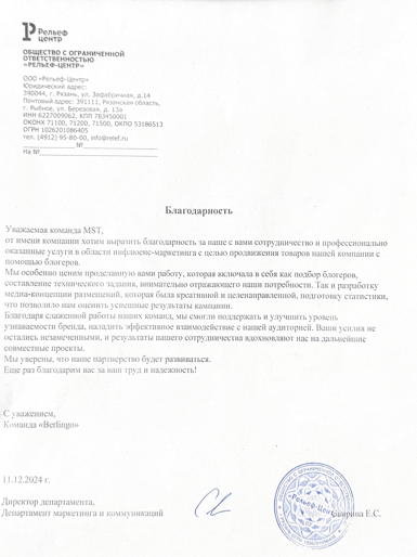Для каждого блогера мы создали индивидуальные сценарии, адаптированные под стиль их контента (например, обзоры, лайфхаки, шоу), и согласовали их с клиентом. Наборы продукции «Берлинго» отправлялись блогерам, а технические задания включали демонстрацию товаров и ссылки на сайт. Видео проверялись перед публикацией, чтобы обеспечить качество и соответствие бренду.