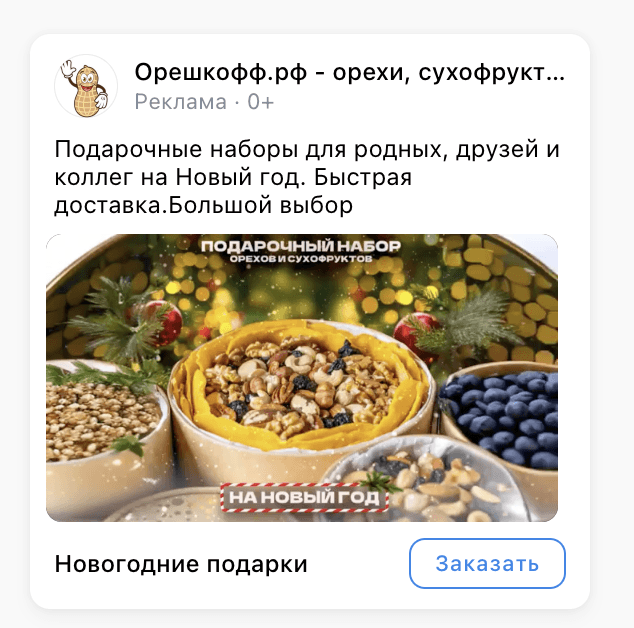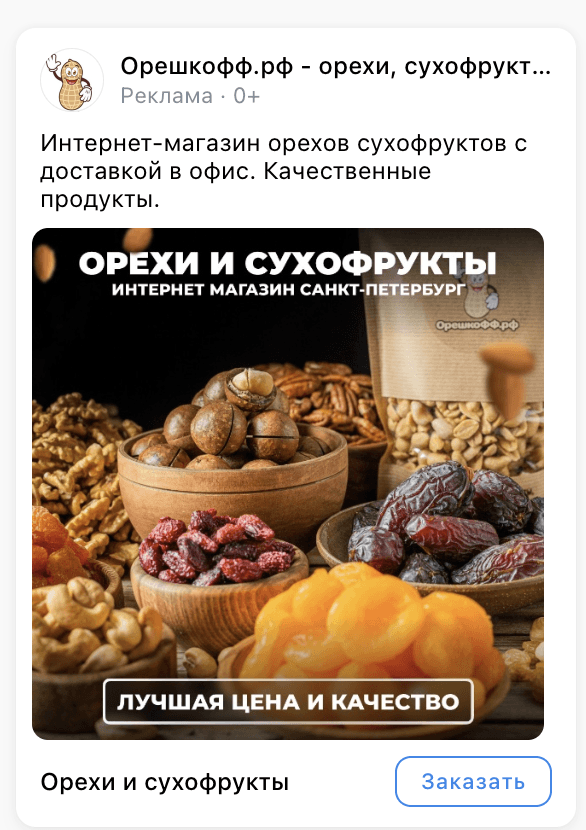 Таргетировались по ключевым запросам за короткий период поиска, по интересам и по базам данных емайл и телефоны юридических компаний, а также по подписчикам сообществ, где могут сидеть потенциальные клиенты для заказа орехов на дом.