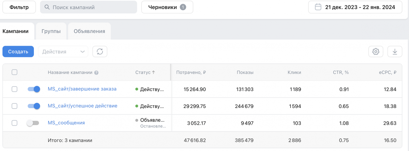 Рекламные объявления, которые использовали имеют высокий CTR 2.03 - 2.47% и низкую стоимость за клик 8 руб - 10 руб (CPC) :