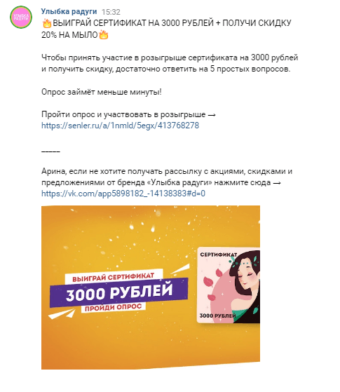 Мы тестировали различные офферы по привлечению аудитории в рассылку. Лучшие результаты дает бонус. Основное наше предложение — розыгрыш 3000 баллов на карту лояльности. В дальнейшем их можно потратить на покупке в магазине. Розыгрыш проводится ежемесячно.
